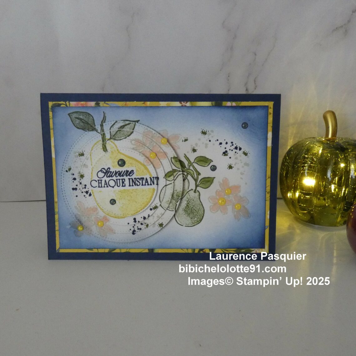 Une carte douce comme un après-midi d’automne, où le papier devient un petit moment de bonheur à partager. J’ai choisi des teintes lumineuses et naturelles. Elles font ressortir ces jolies poires. Les poires sont un symbole de simplicité et de plaisir du quotidien.