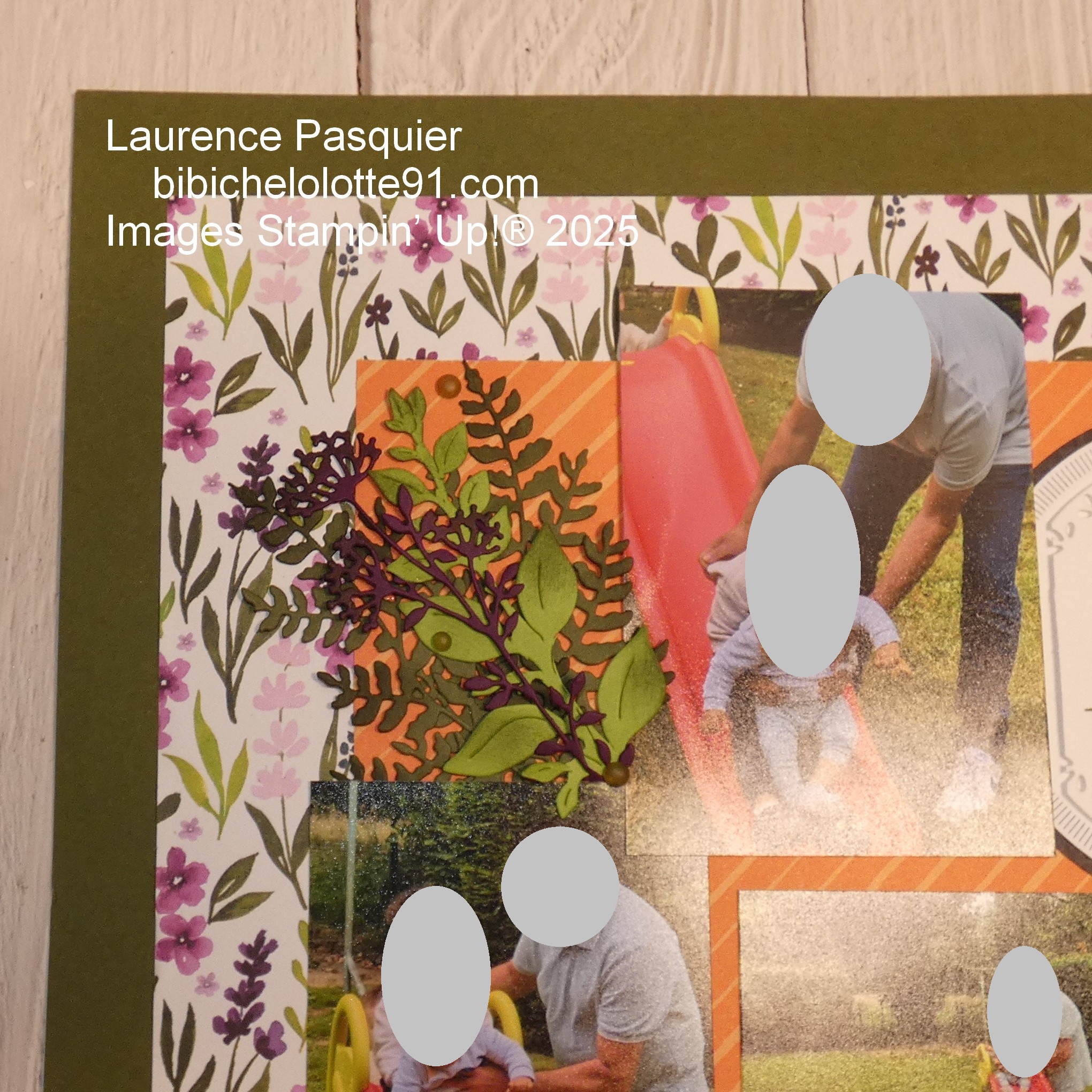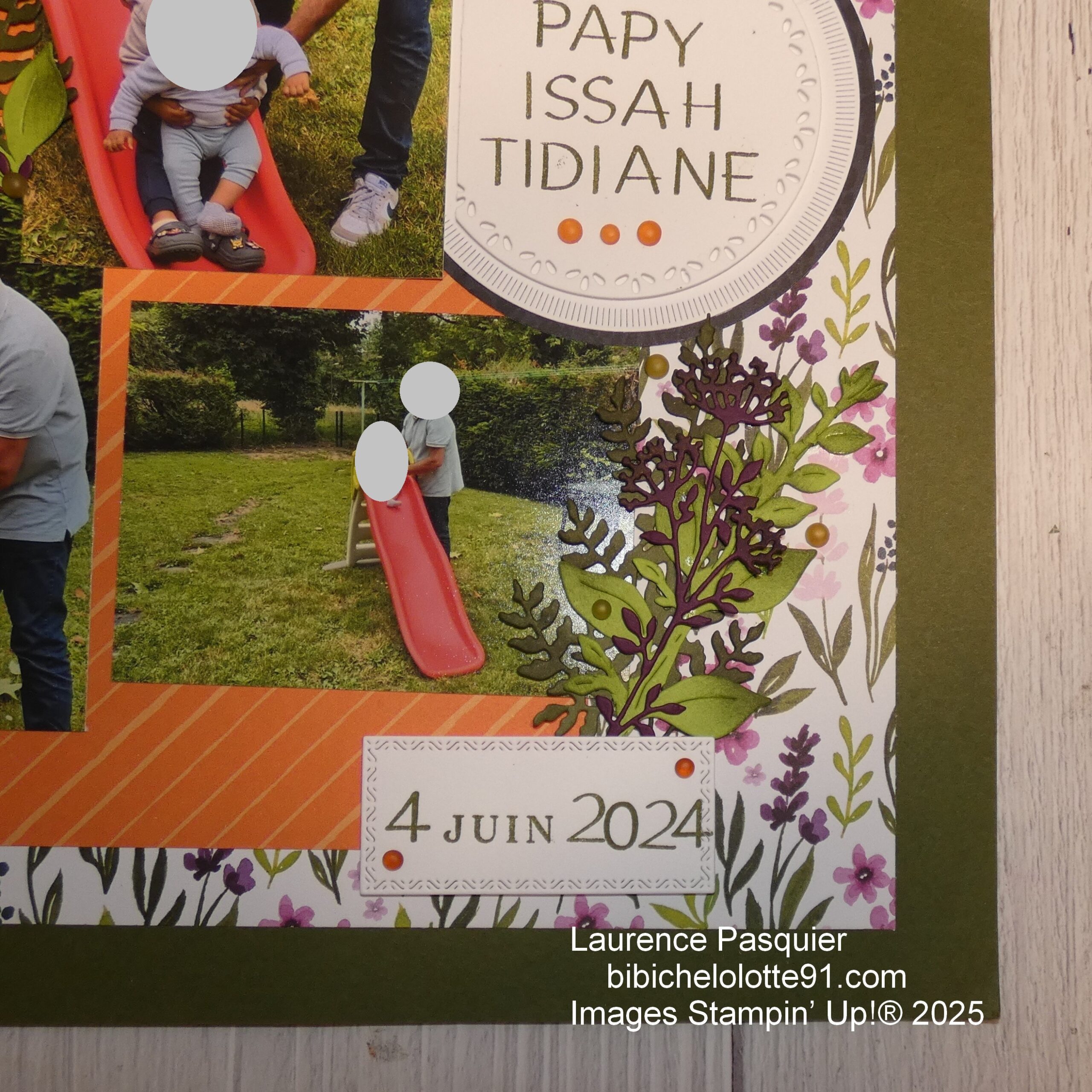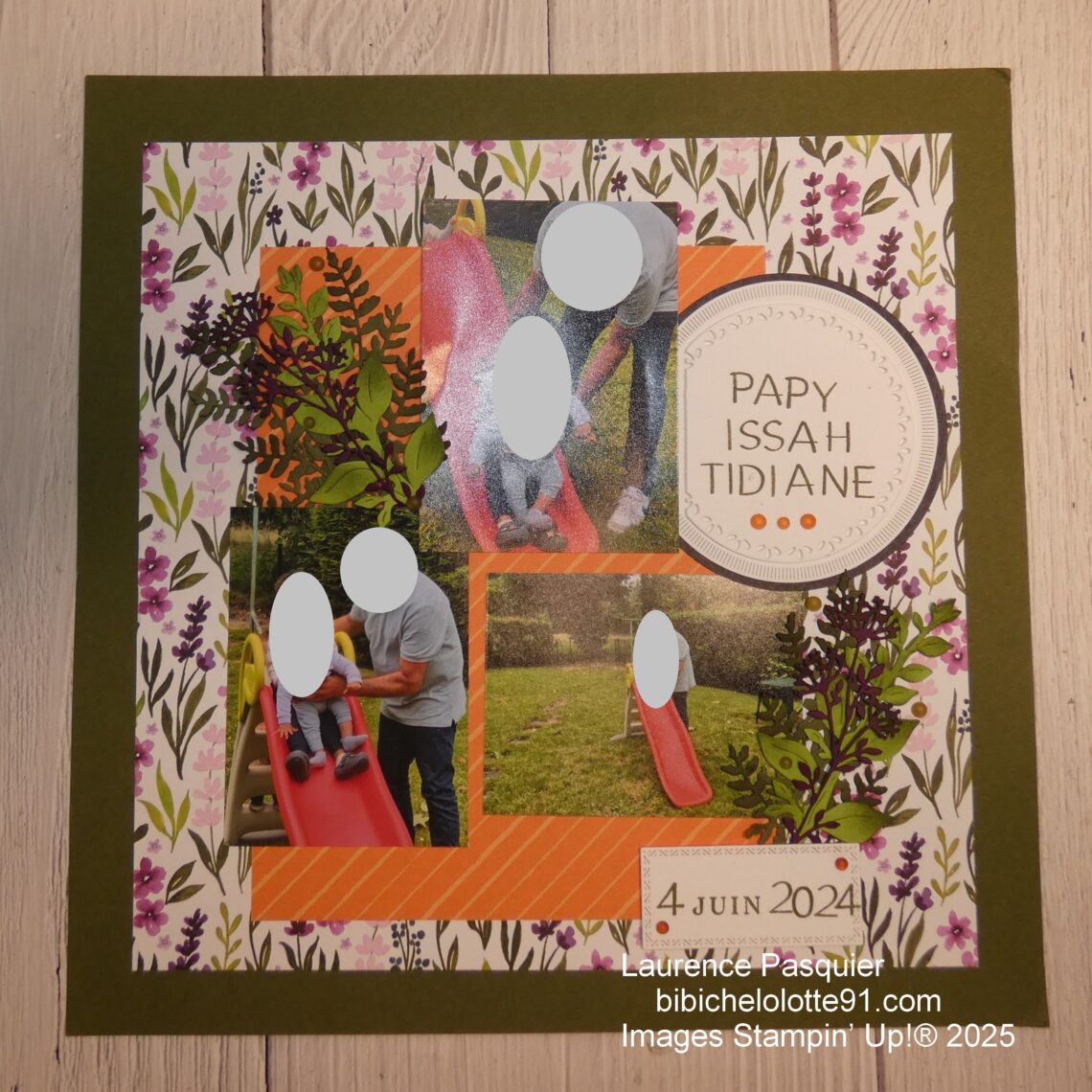 Pour cette page, j’ai choisi des tons chauds et naturels : le vert olive pour rappeler la nature, l’orange pour l’énergie et la joie, et ce papier fleuri pour ajouter une touche de douceur.