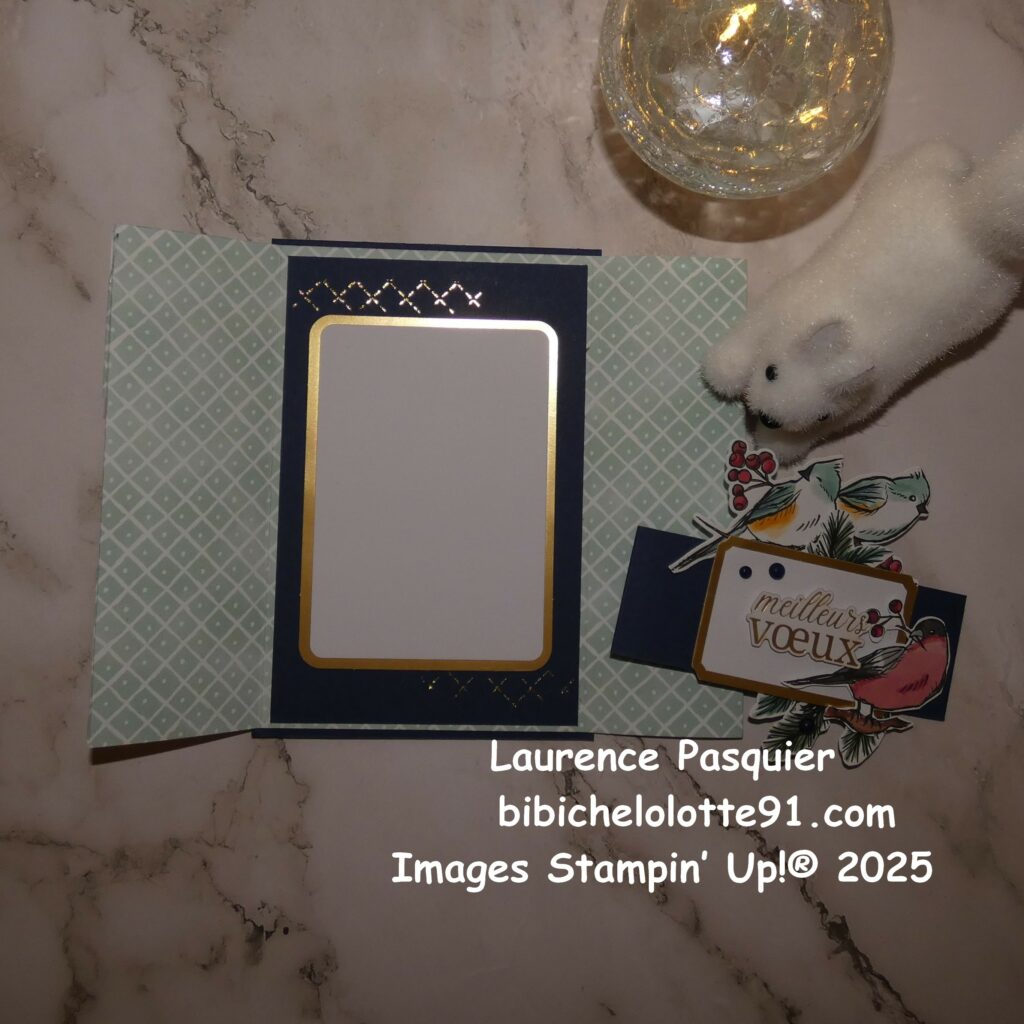 Cette carte de vœux met en valeur un joli fond graphique dans des tons apaisants. Il est rehaussé par un cadre au fini doré. Cela apporte une touche précieuse sans en faire trop. J’aime particulièrement ces petits détails brillants qui captent la lumière et donnent tout son charme à la création.