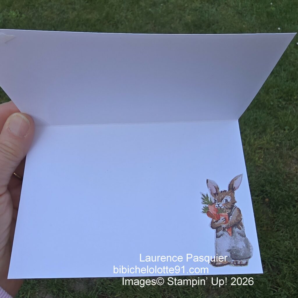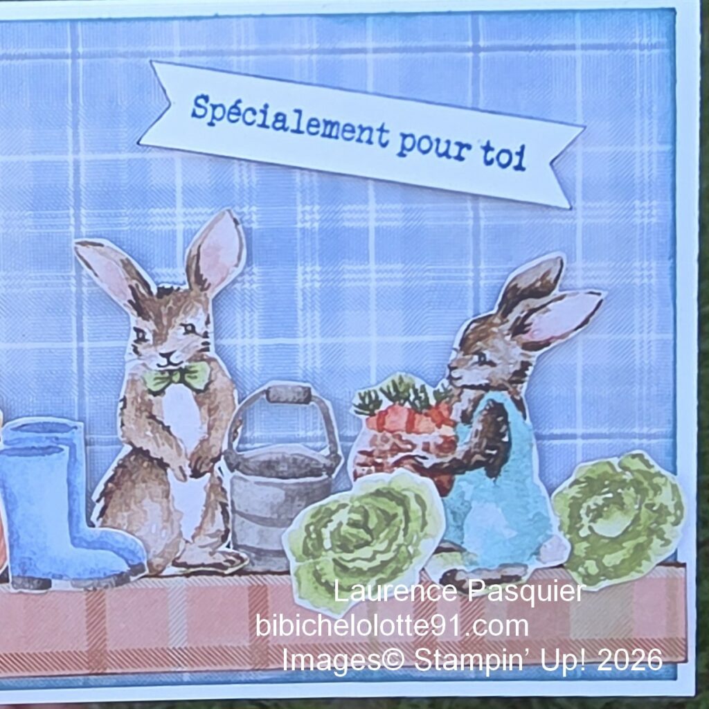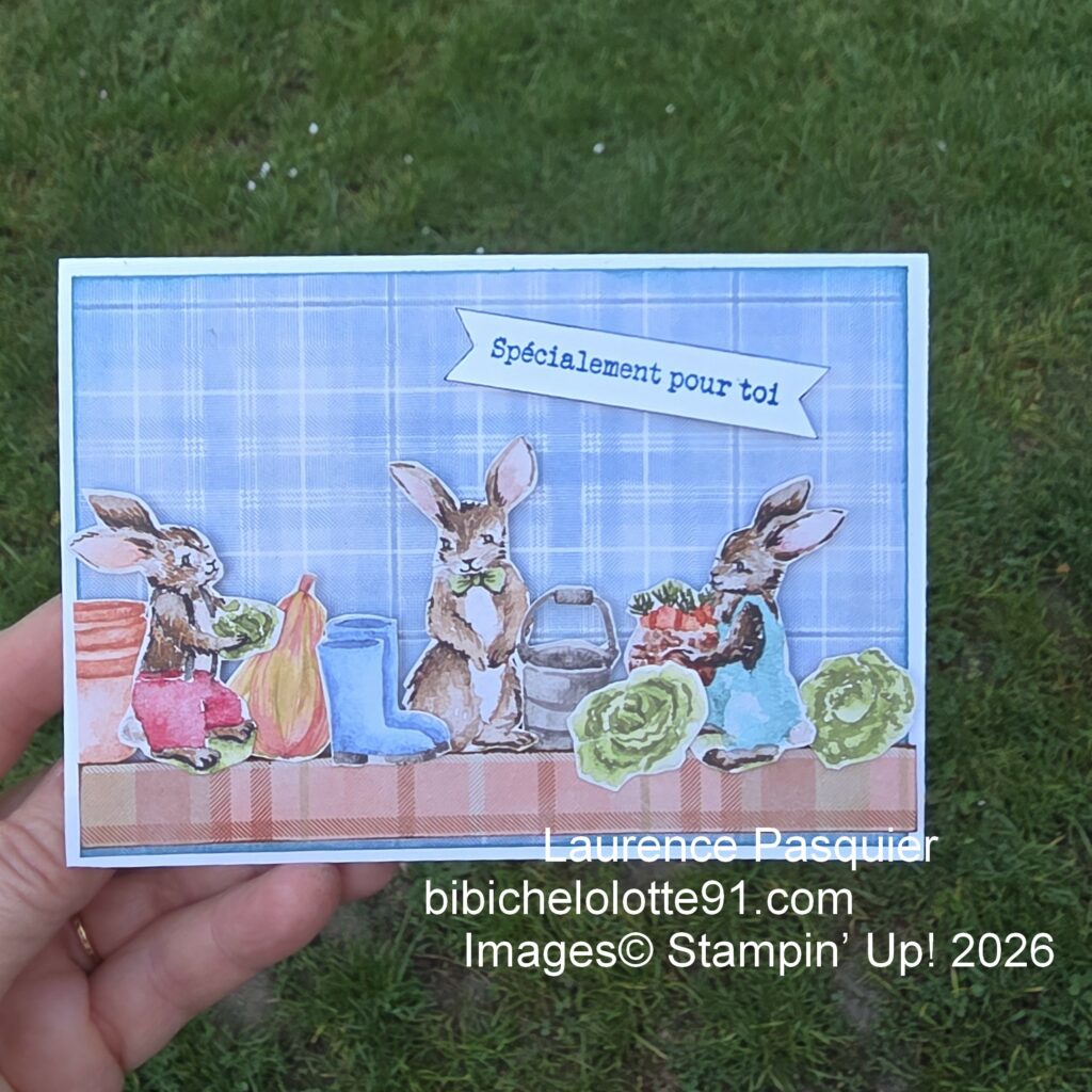 J’ai choisi un fond à carreaux bleus qui met parfaitement en valeur les personnages sur des mousses 3D. Les petits lapins semblent installés dans leur potager, leurs légumes fraîchement récoltés. Cela crée une ambiance douce et amusante, parfaite pour une carte destinée à un enfant.